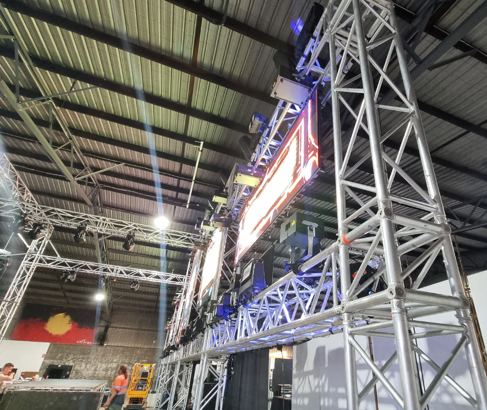 AU Music Productions’ modular truss setup at Super Ordinary BNE, featuring LED screens, lighting, and PA systems.