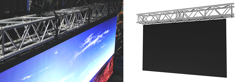 The F35, F45 and F55 Truss are based on the F34 290mm x 290mm, F44P 400mm x 400mm and F54 520mm x 520mm truss design and, as mentioned, is designed for applications such as LED screens where balanced centre rigging of the screen panels on the truss is essential. A central chord with ladder-style horizontal bracing on the bottom face of the truss allows LED panels to be clamped directly onto the centre chord. This negates the need to balance the load by slinging or bracing across the two bottom chords to provide central rigging points as would normally be necessary on a square format truss.