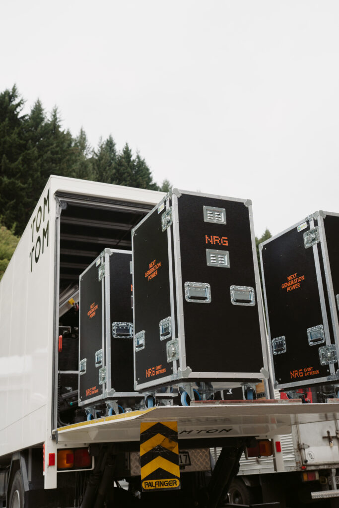 NRG Event Batteries deliver three-phase power for professional audio, lighting, and staging applications. Operating from New Zealand’s predominantly renewable South Island grid (95–98% renewable). This enables zero onsite emissions and removes generator noise entirely—improving conditions for crews, audiences, and surrounding environments.